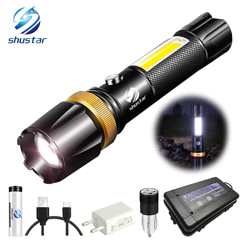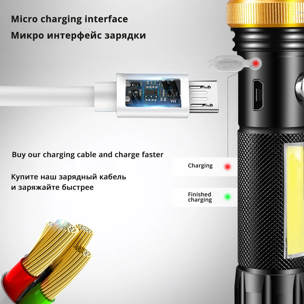 HIGH QUALITY Super bright Waterproof LED Flashlight With COB side light Rotary zoom 3 lighting modes Powered by