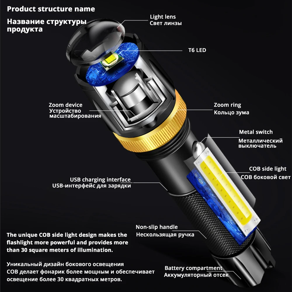 Super bright Waterproof LED Flashlight With COB side light Rotary zoom 3 lighting modes Powered by