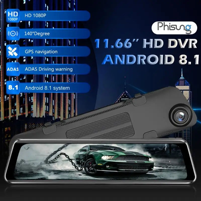 Phisung Z66 4G Android 8.1 FHD 1080P Car DVR Camera 11.66 inch Rearview Mirror Dual Lens WiFi GPS A