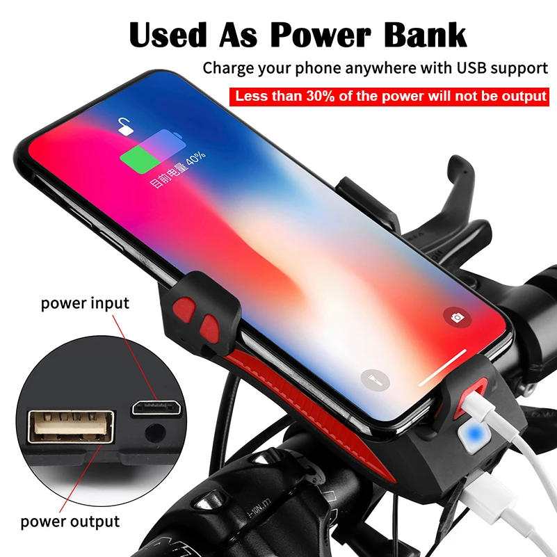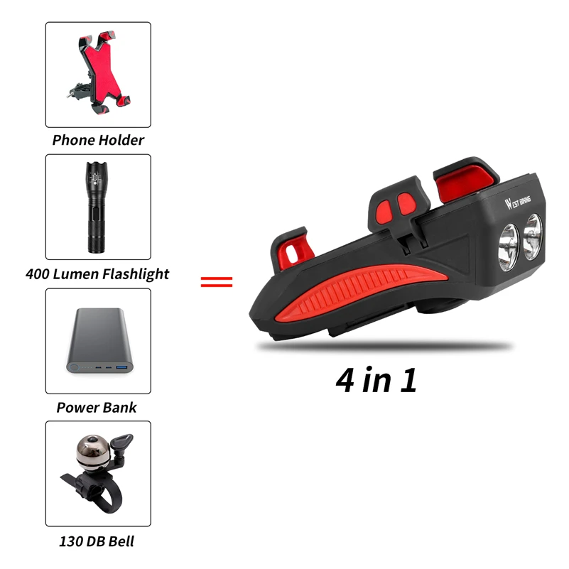 WEST BIKING Bike Light 2000mAh/4000mAh Battery Power Bank Phone Holder 130DB Speaker Bell 4 in 1 MT