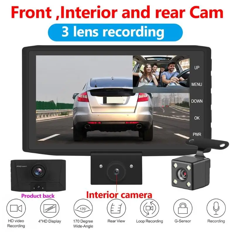 VODOOL 505 4" 3 Lens Car DVR Camera Full HD 1080P Three Way Dashcam Auto Video Recorder G-sensor Ni